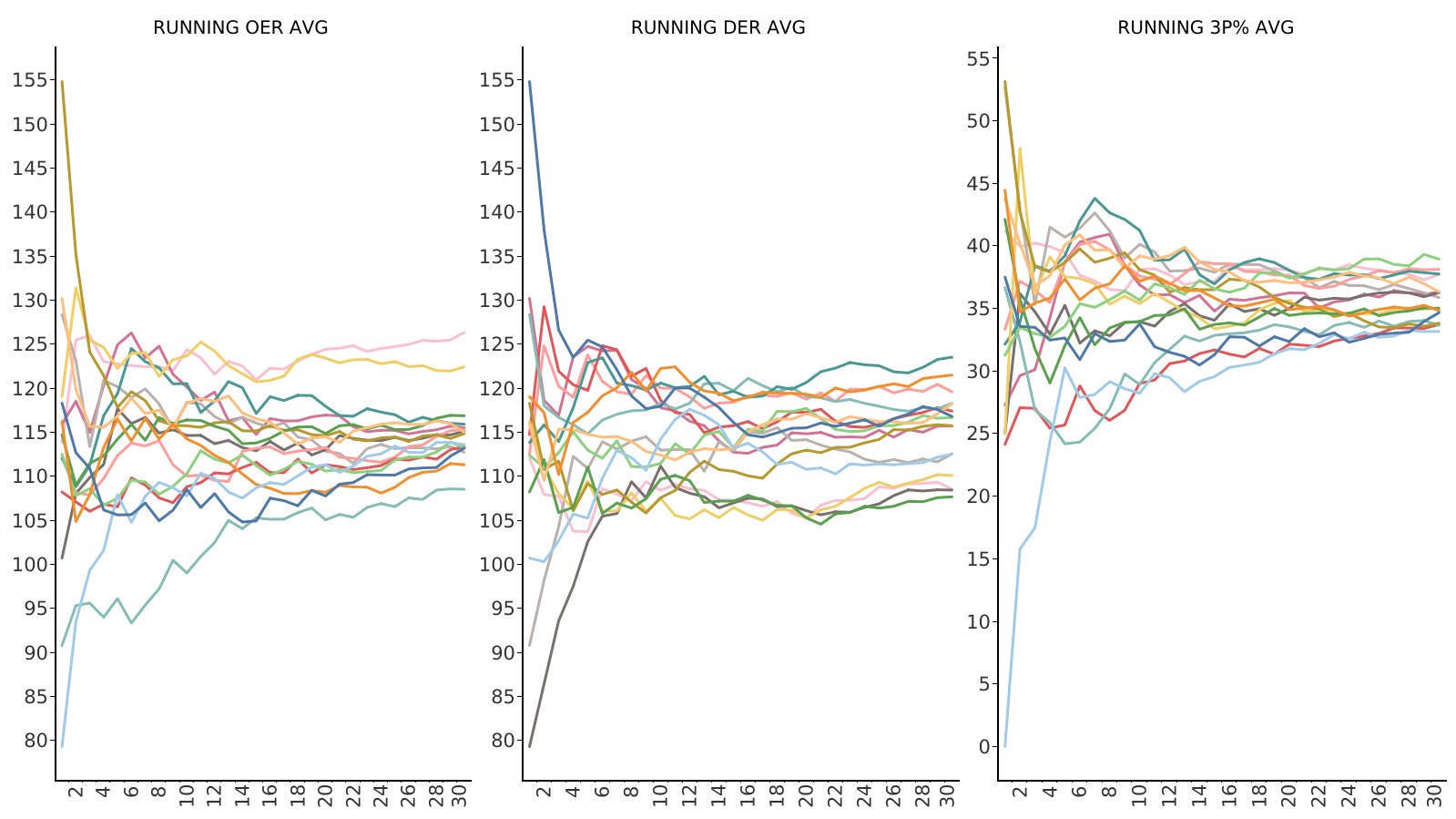 In the image below, we chart the running average of the mentioned metrics as the season progresses. Each line represents a different team's data.