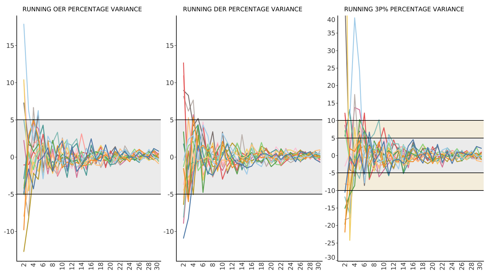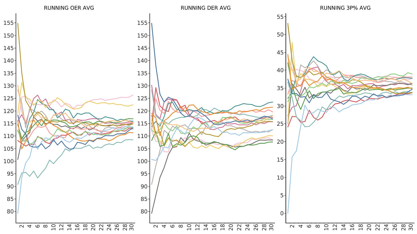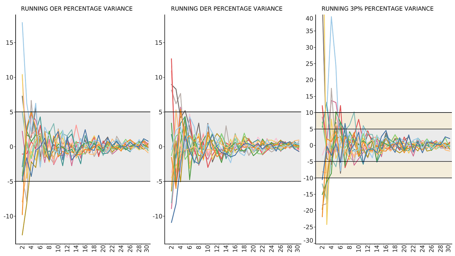 What we find is that for OER and DER, the cumulative average stabilizes to within a 5% variation after just five games. When it comes to 3P%, it takes a little longer: by Game 6, the variation drops to below 10%, and by Game 11, it’s within 5%.